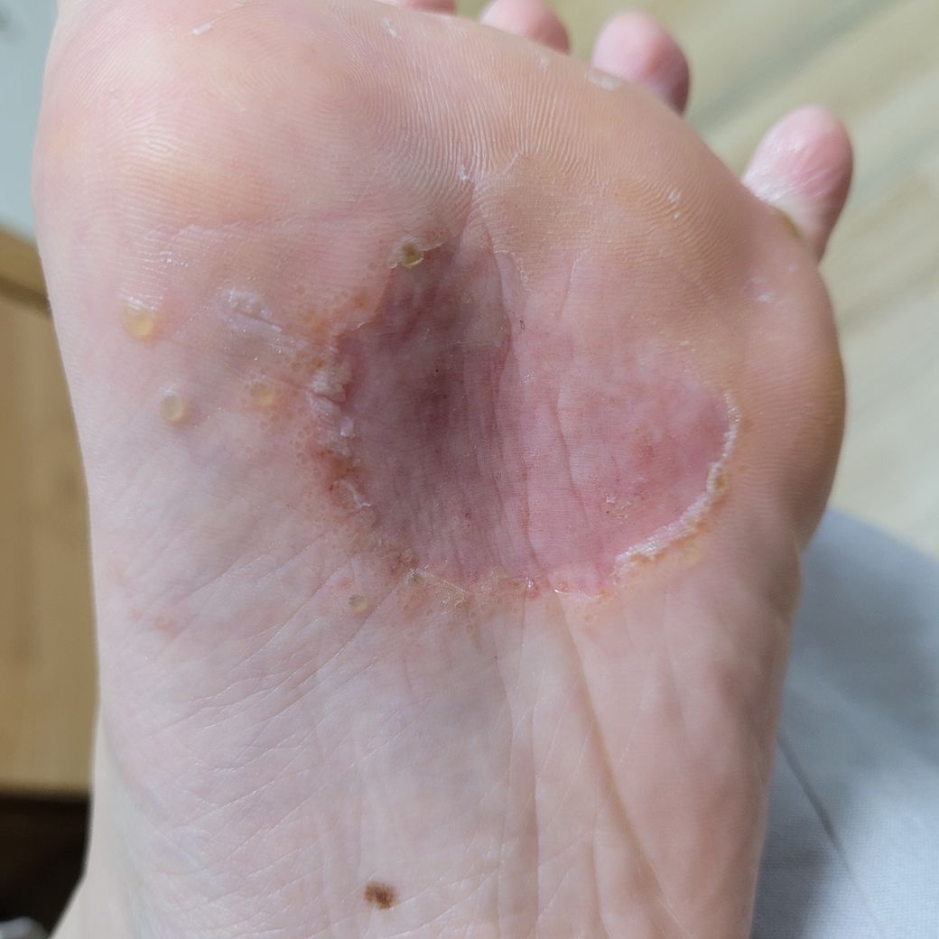 물집이 합쳐져 큰 병변을 만들었고 발바닥에 국한되어 있다는 점에서 한포진이 의심스럽습니다. 한포진이 맞다면 물집이 이미 터진 상태로 보이고 곧 거칠거칠한 각질로 뒤덮힐 수 있을 것 같습니다. 이 시기엔 각질을 녹이는 연고를 바를 수 있는데, 병원에서 처방받으셔야 하므로 병원을 다시 방문해보시는 것이 좋겠습니다.