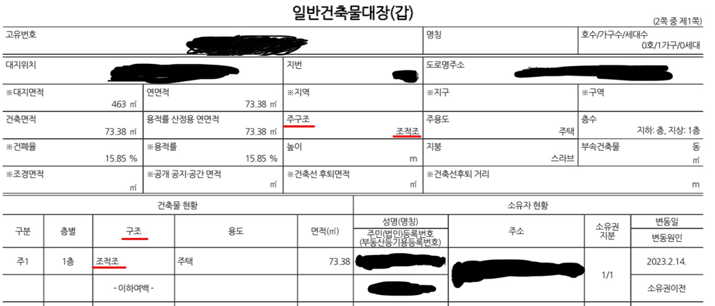 빨간줄을 그은 것처럼 건축물대장과 등기부에는 '조적조'라고만 기재되어 있고,