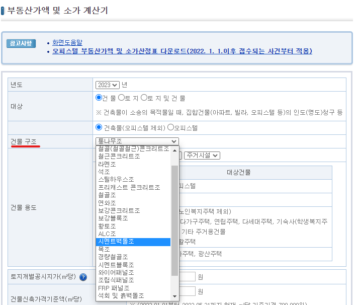 다만 부동산가액 및 소가계산 중 아래 사진과 같이 '건물 구조'를 어떻게 해야 할지 모르겠습니다.