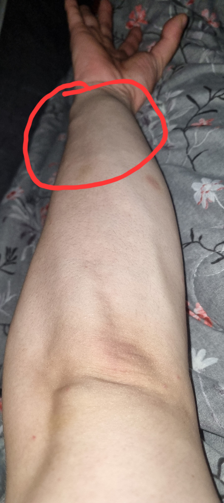 또 종아리와 손등,팔목 혈관쪽에 노란색 멍과 부종이 있습니다