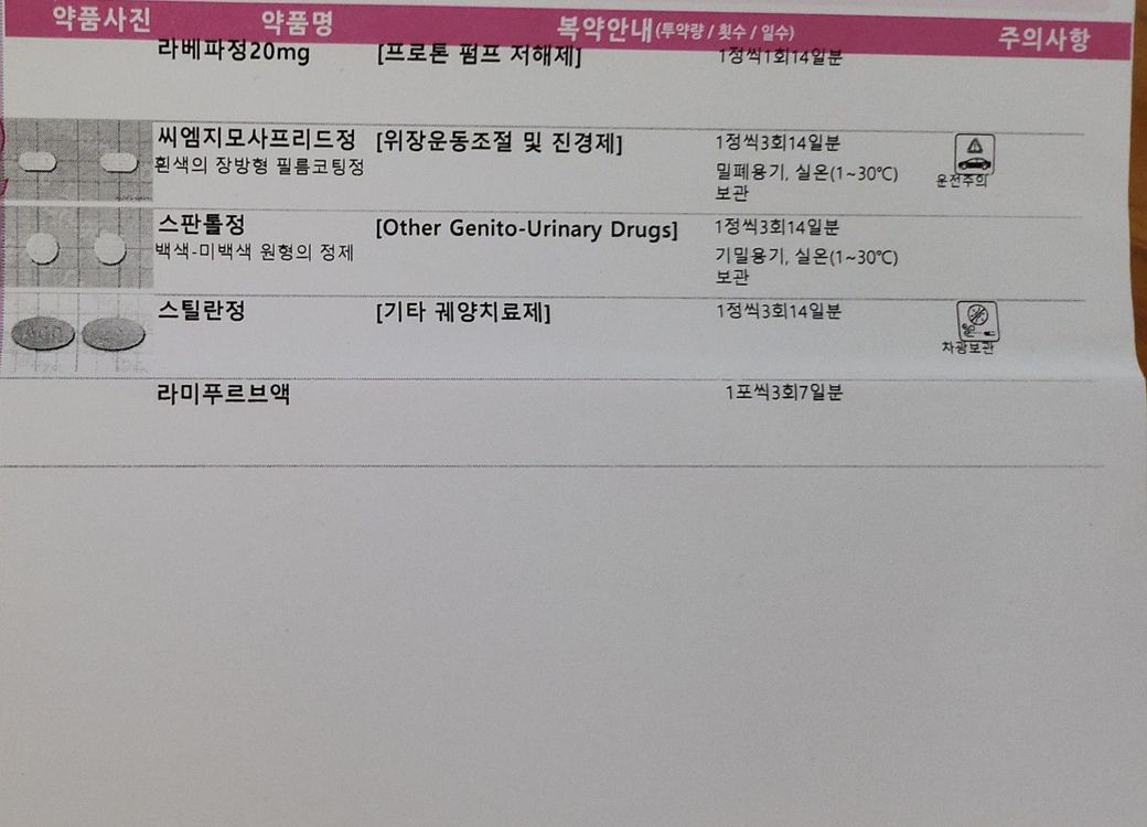 라베파정 / 씨엠지모사프리드정 / 스판톨정 / 스틸란정 / 라미푸르브액 위장약들과