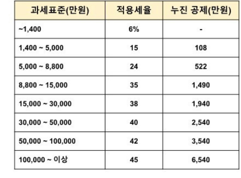 차감한 종합소득 과세표준이 증가할수록 소득세 부담세액이 커지는 것입니다.