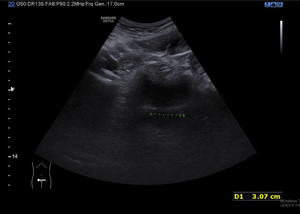 초음파 검사가 하복부 쪽 위치에 촬영된 점 및 초음파 사진의 구조물의 생긴 모양을 보았을 때에는 방광을 촬영한 영상일 가능성이 가장 높아 보입니다.