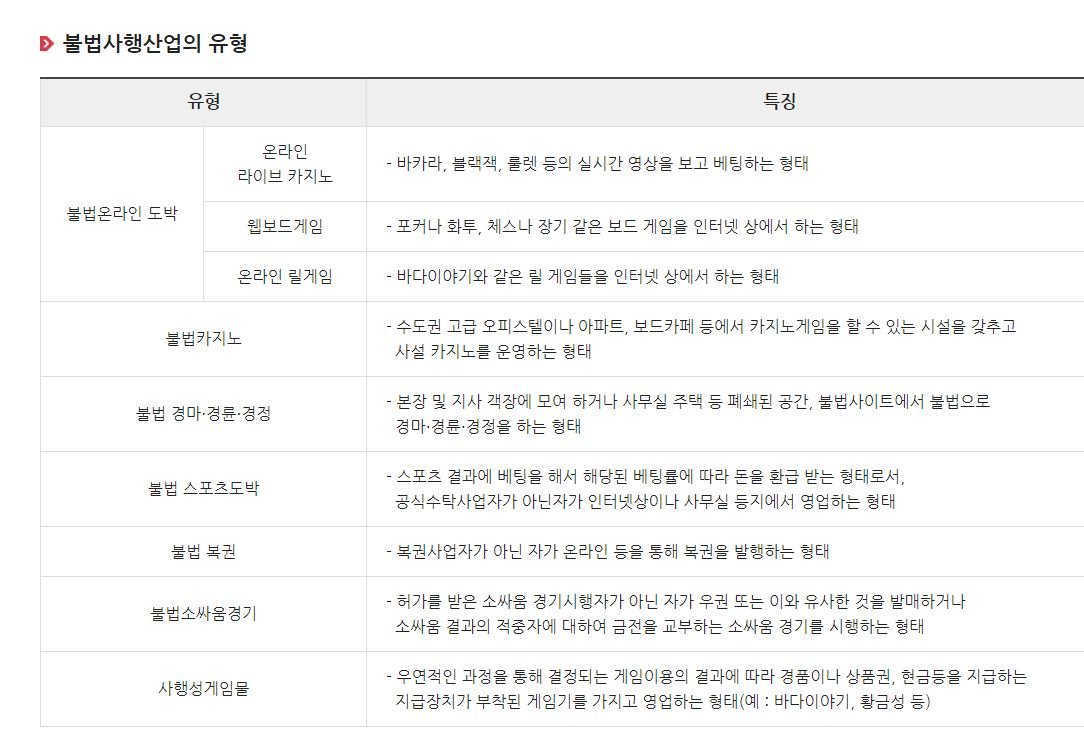 사행산업통합감독위원회에 보면 아래와 같은 내용이 불법사행산업으로 규정되어 있습니다.