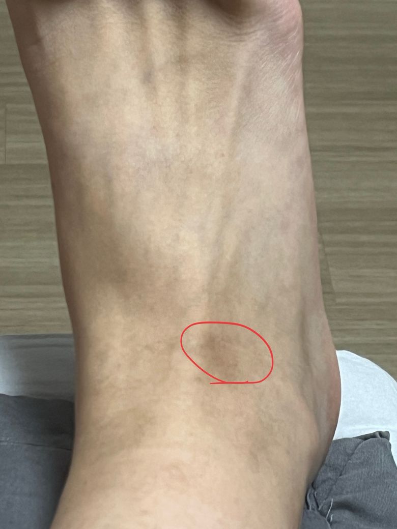 사진에서 가르키는 부위는 전거비 인대를 말씀하시는 것으로 보이며 외상이나 염증 등으로 피부색소가 침착되어 색깔이 다르게 보이는 것으로 보입니다.