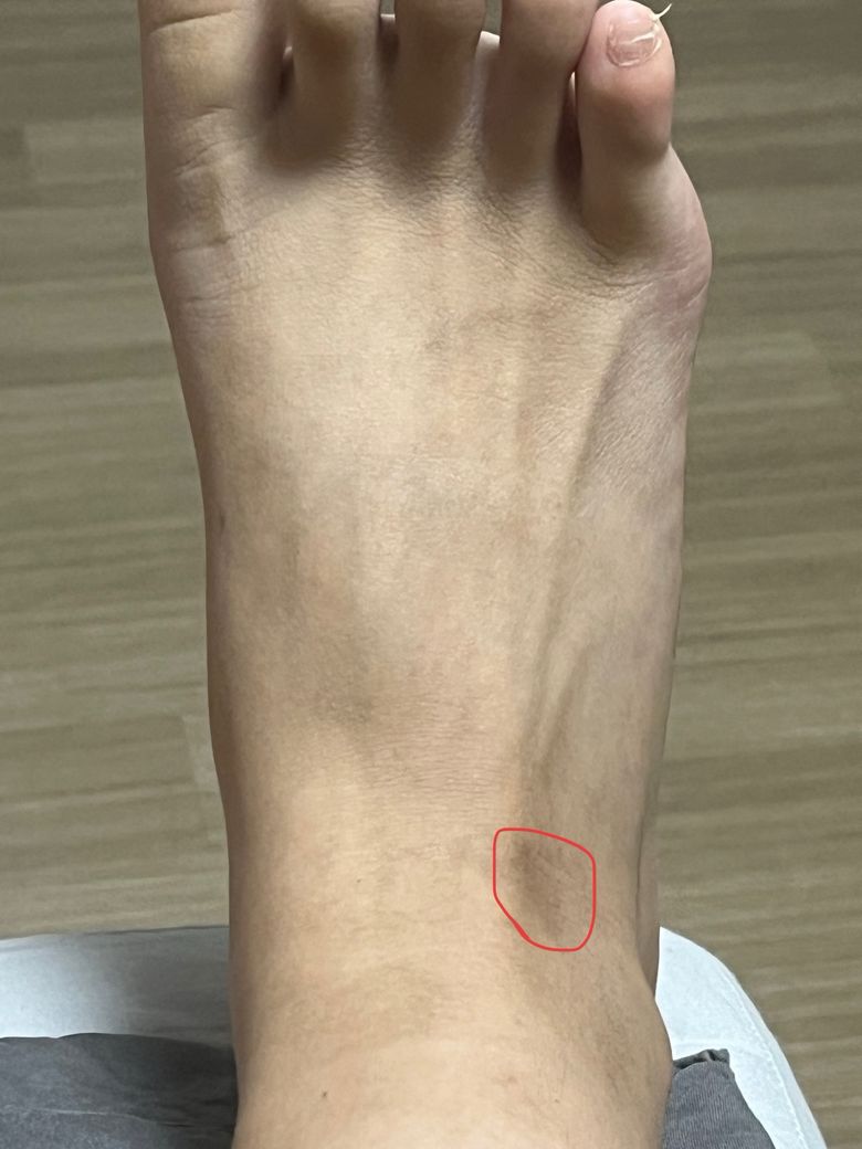 사진 상 정확히 확인을 하긴 어렵지만 전거비 인대 또는 발의 신전근으로 보여집니다.