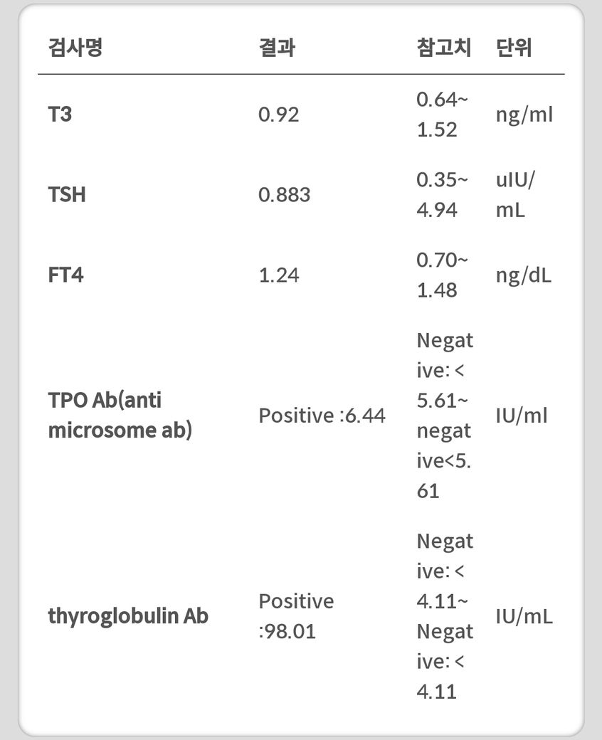 갑상선 기능 저하증으로 인해 병원에서 검사를 했는데 수치가 괜찮게 나온건지 알고싶습니다. 1)하시모토 갑상선 수치는 괜찮은거가요?