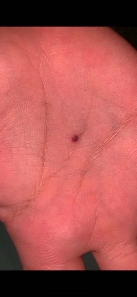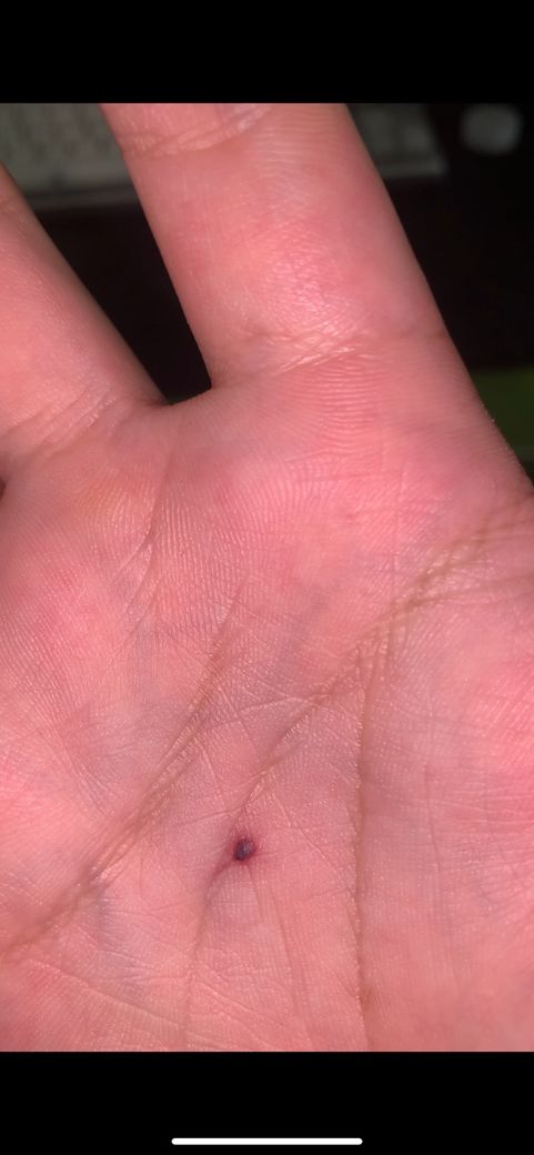 오늘 아침 손바닥에 갑자기 생긴 점입니다 뭔가 묻었나 싶어 긁었더니 사진처럼 붉게 변했네요 흑색종은 아닐까 불안하네요..... 자세히 보면 검은색이나 갈색 계열이 아닌 약간 회색빛?입니다