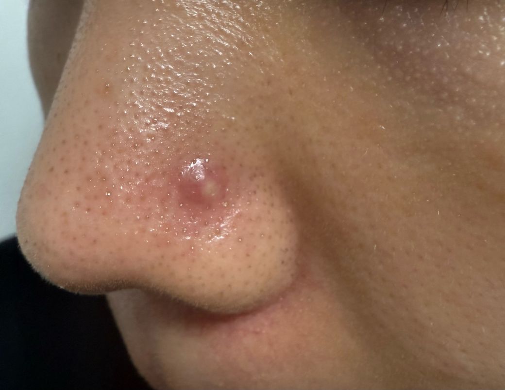 사진상으로는 중심에 고름이 형성된 염증성 여드름(pustule) 혹은 초기 종기(furuncle)에 가까운 소견입니다. 주변 홍반과 압통이 동반된 점으로 보아 세균성 염증이 일부 관여했을 가능성은 있습니다.