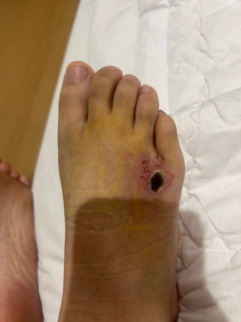 발등을 차바퀴에 깔렸는데 가장 심하게 깔린곳 피부가 검정+노랗게 변했는데 피부 괴사일까요? 수술도 필요한가요???????