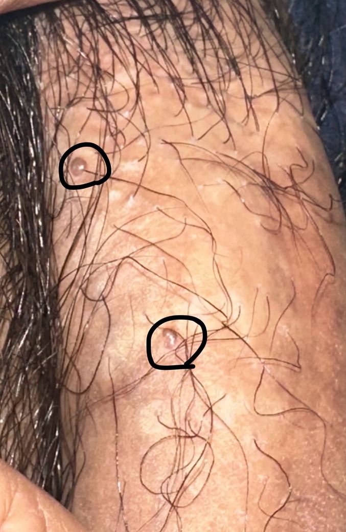 사진에서 보이는 병변은 모공 중심에 작은 돔 모양으로 올라온 구진이며 중앙에 검은 점 또는 각질 마개처럼 보이는 부분이 있습니다. 형태상 가장 흔한 것은 모낭염 또는 피지·각질이 모공에 막히면서 생기는 개방면포(블랙헤드) 또는 작은 표피낭종 초기 형태입니다. 이런 경우 털이 있는 음경 기둥 부위에서 비교적 흔히 관찰됩니다.