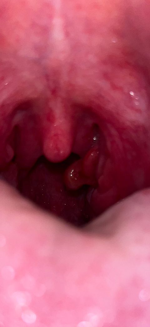 사진상으로는 tonsil 부위에 생긴 상피 증식, 용종 등으로 생각되는데 lymphangioma tonsil 또는 tonsil polyp과 유사하게 모양새가 보입니다. 구글 등에 검색해보시고 병원에 가서 정확한 진단을 받아보시기 바랍니다.