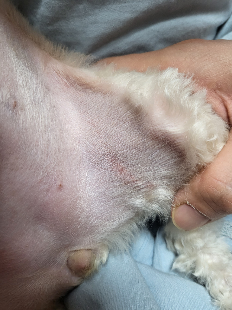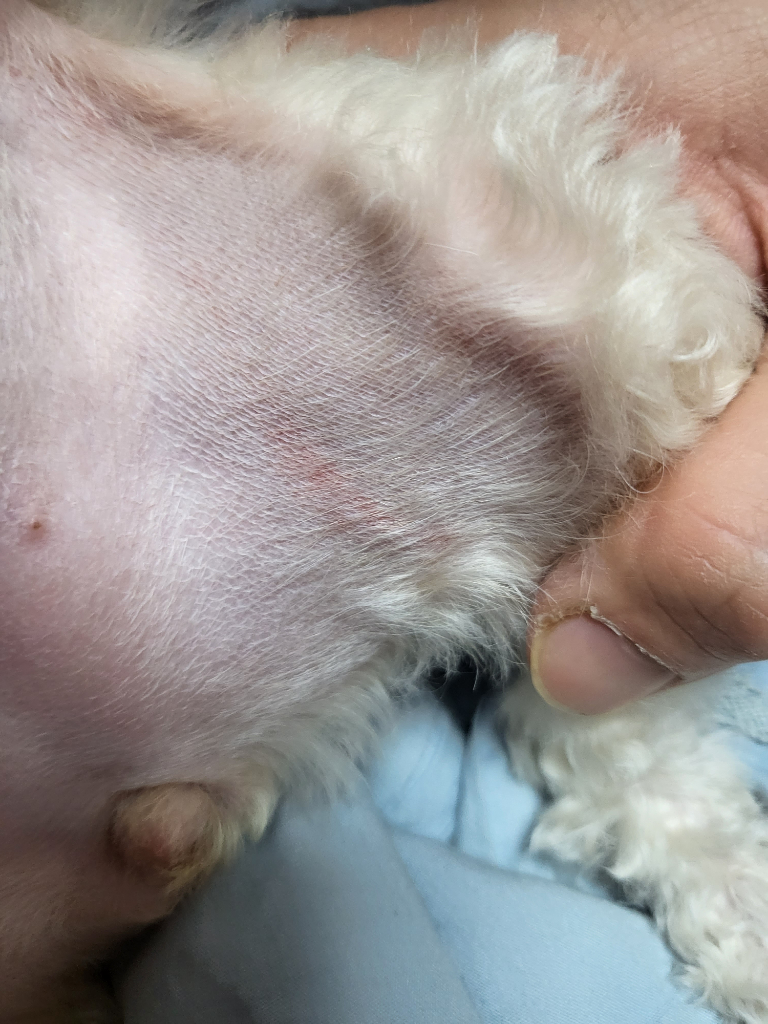 그냥 발적이 있는 상태로 보이지만 간지러움을 느끼는 등의 반응이 있다면 자해로 인한 이차 손상 및 이로인한 피부 질환이 발생할 수 있습니다.