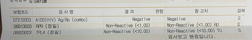 검사 결과에 따르면, HIV (인간면역결핍바이러스) 항원/항체 결합 검사, RPR(매독 빠른 백혈구 침강 반응) 검사, 그리고 TPLA(매독 트레포네마 소파 항체) 검사 모두 음성 또는 비반응성으로 나타났습니다. 이는 HIV 및 매독 감염의 증거가 없음을 의미합니다.