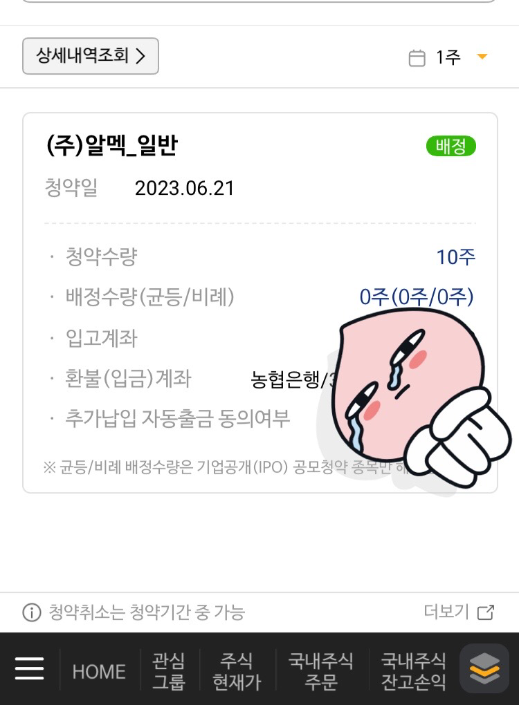알멕이가 물멕였요 ㅠ.ㅠ 0.34주라서 못받을수도있겠구나했는데 정말로 못받았네요ㅠ.ㅠ 균등배정을 받고 못받고 혹시 기준이있나요? 예를들어 최소수량만 청약했을땐 확률이 적어진다거나 주식잔고가 얼마냐에따라(?) 그러진않을것같긴한데;; 암튼, 어떤 기준이 혹시나있을까싶어서 아쉬운마음에 질문드려요~