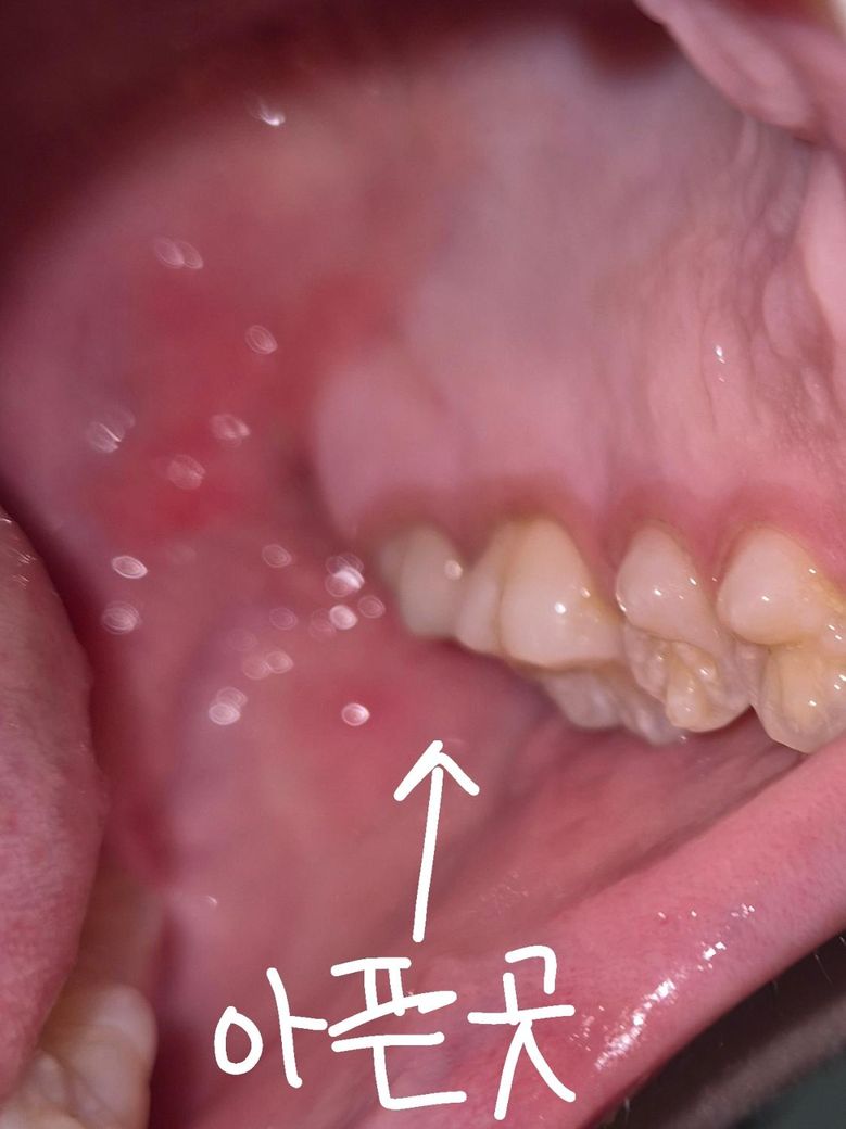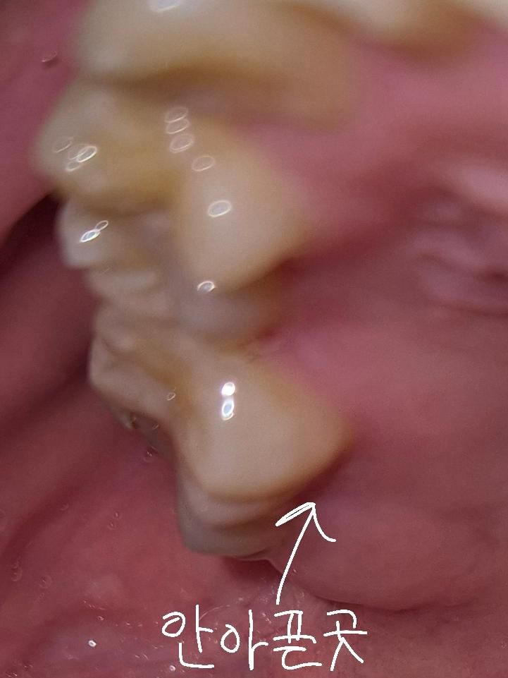 제가 갑자기 뜨거운것을 먹거나 차가운 것을 먹으면 왼쪽 끝 치아 쪽이 시려서 병원을 가게되었습니다. 육안으로 이상이없다고하셔서 3주째 글루마(상아질접착제를) 주마다 1번씩 가서 바르고 왔는데요. 바르고만오면 목안쪽까지 손톱으로 긁은것처럼 아파서 사진을 찍었습니다.