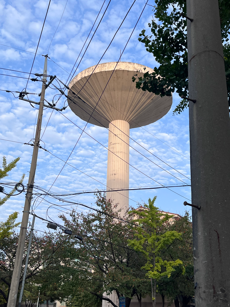 고가수조입니다. 요즘 아파트에는 없는데 옛날 아파트들은 물을 다같이 쓰면 수압이 약해지고 물 공급에 문제가 생겨서 지대가 다소 높은 곳에 고가수조를 지어 물을 보관했다가 물사용량이 많아지면 중력을 이용해 무동력으로 물울 공급했습니다. 건물 꼭대기에 솟아 있는 것은 피뢰침입니다.