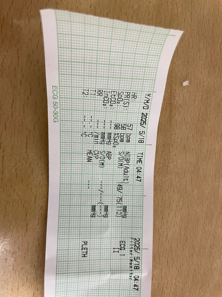 현재 사진상에 보이는 심전도는 리듬을 위주로만 보여주는 심전도로 정식 심전도가 아니므로 판독하긴 어렵습니다. 해당 리드 심전도에서는 부정맥이나 허혈 소견은 명확히 관찰되지 않는 것으로 보이나 정식 심전도를 통해 판독하는 것에 의미가 있습니다.