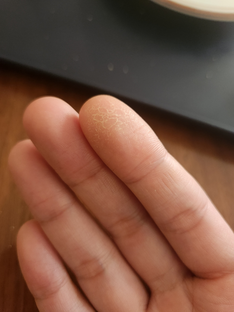 사진의 소견을 통해서 볼 때에는 습진 같은 문제의 가능성이 높아 보이는 소견입니다. 뜨거운 밥그릇을 잡았다고 하여서 해당 병변이 생길 가능성은 높아 보이지 않습니다. 정확한 감별 진단 및 치료를 위해서는 피부과에서 진료를 받아보시길 권고드립니다.