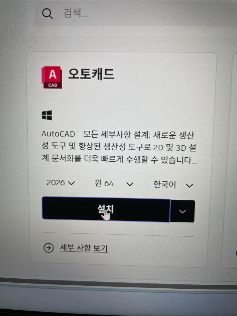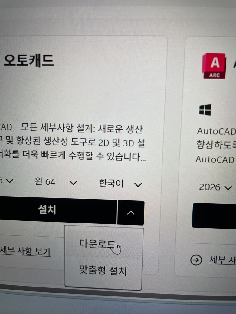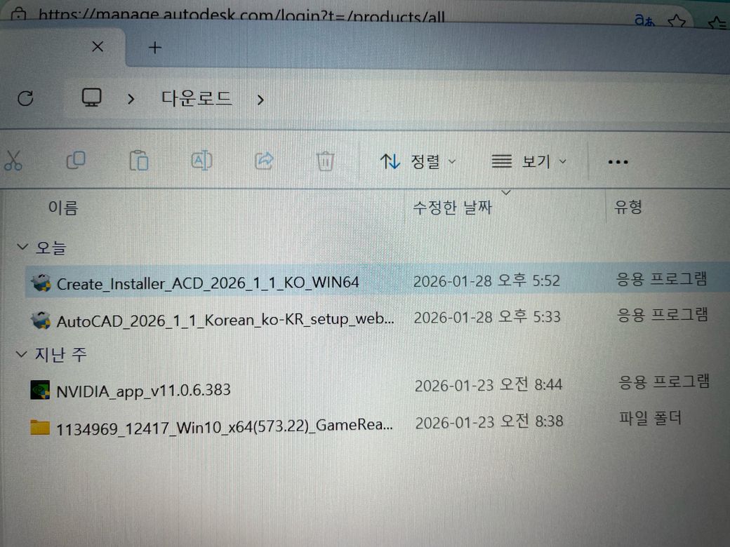설치버튼은 웹 설치 방식이고 인터넷 연결 상태에서 바로 설치가 가능합니다. 설치 파일을 PC에 저장해서 나중에 오프라인으로 설치할 수 있게 해주는 방식입니다. 두개 다 눌러서 각각 다른 파일이 받아진거는 정상입니다. 보니까 두개 파일이 있는데요. 설치 실행 파일과 설치 관리자 파일이에요. 둘다 학생용 오토캐드 설치에 필요한겁니다. 설치 중에 노트북을 다시 시작하세요라는 문구가 나왔다면 그래픽 드라이버나 시스템 파일이 바뀌었을 가능성이 있을것 같고 AutoCAD는 그래픽 성능을 많이 쓰는 프로그램이라서 재부팅이 필요할겁니다. 재부팅 이후 바탕화면이나 시작 메뉴에 AutoCAD 2026 아이콘이 생겼는지 보시고 실행 하실때 학생용 라이선스 인증이 완료되었는지 확인해보시면 됩니다.