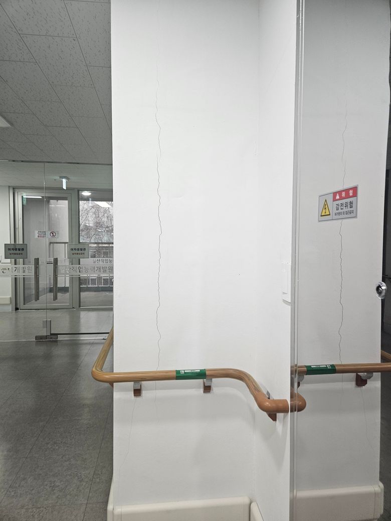 안녕하세요 저는 기숙사에 살고 있습니다 기숙사가 지은지 얼마 안됫어요! 1년반? 2년정도 됐어요! 제가 5시50분에 식당에 밥먹으러 갈려고 갔는데 엘리베이터 옆에 벽이 갈라졌더러고요!