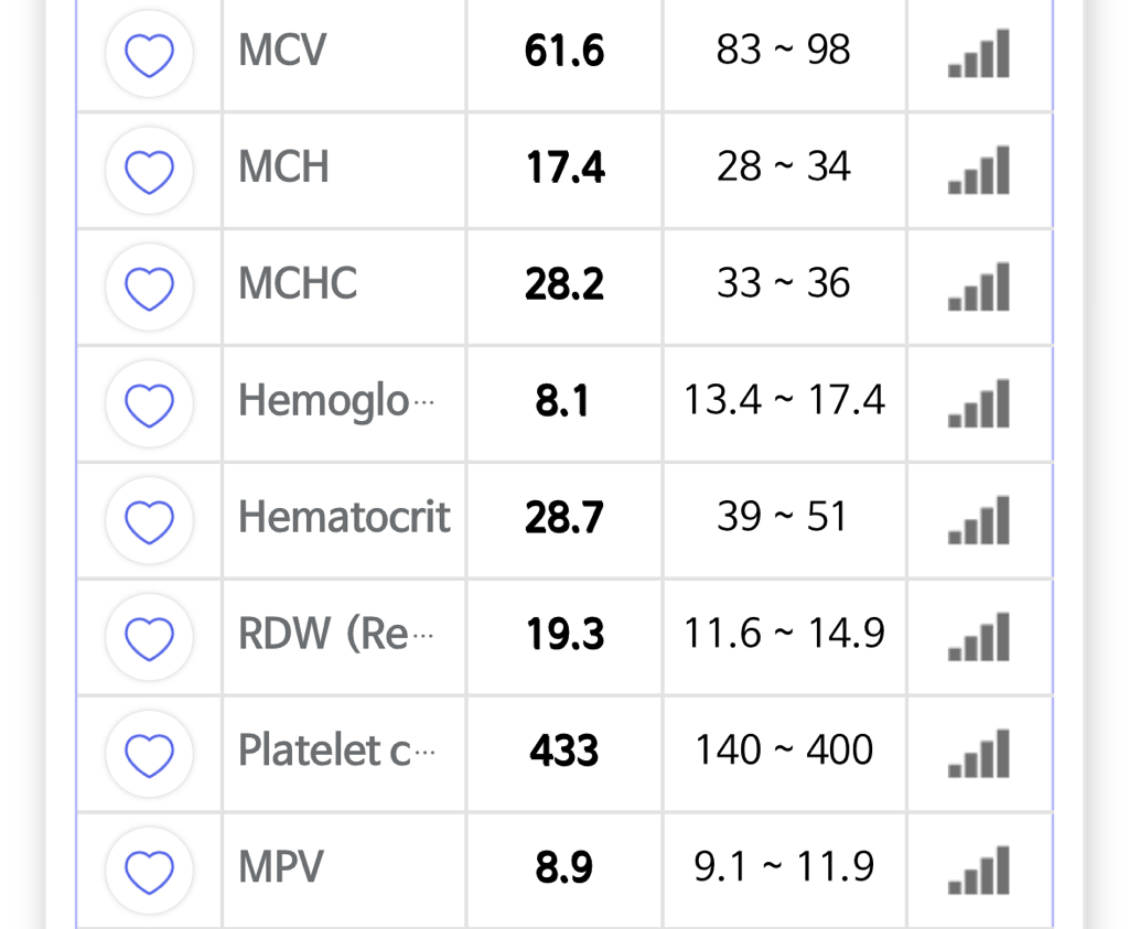 제공해주신 혈액검사 결과를 바탕으로, 혈색소(Hemoglobin), 헤마토크리트(Hematocrit), 평균 적혈구 체적(MCV), 평균 적혈구 헤모글로빈(MCH), 평균 적혈구 헤모글로빈 농도(MCHC)가 모두 정상 범위보다 낮은 것으로 보입니다. 이러한 결과는 빈혈을 나타내는 것으로 보이며, 특히 MCV 값이 낮은 것으로 보아 미세구성 빈혈(microcytic anemia)을 시사합니다.