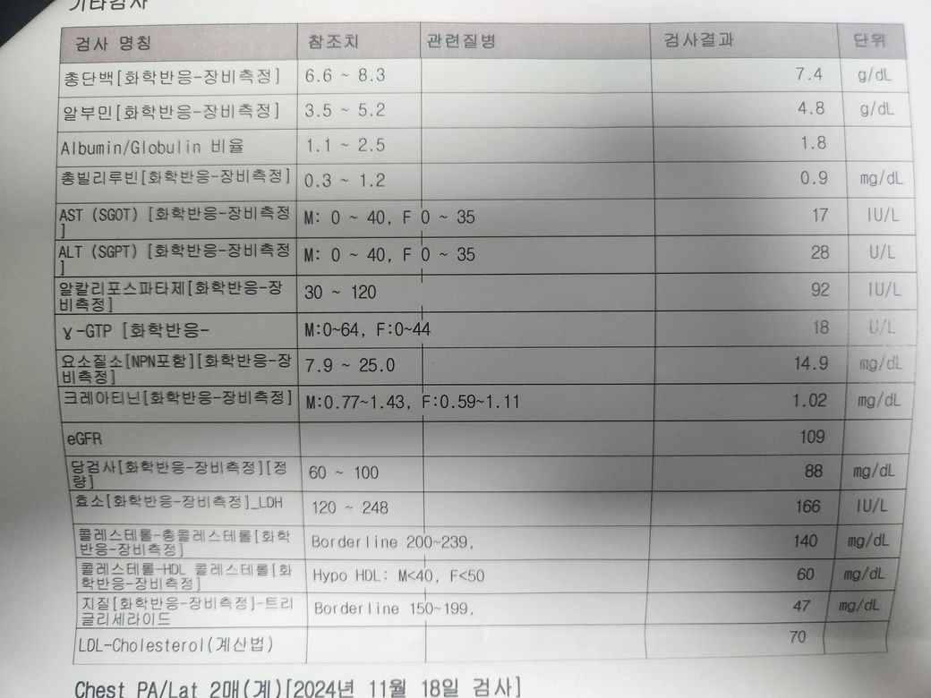 얼마 전 혈액검사 결과표를 봤는데 모든 수치가 정상으로 나왔으나 병원마다 수치가 조금씩 다르다해서 확실히 정상이 맞는지 궁금합니다. 그리고 크레아티닌 수치가 제 나이대에 1.0이 넘어가면 안된다는 얘기를 들은 적이 있는데 혹시 신장 관리를 하는게 좋을까요? 단백뇨와 혈뇨는 없습니다