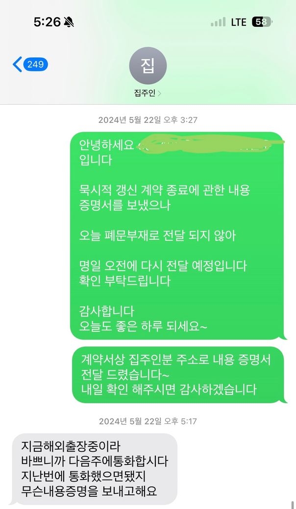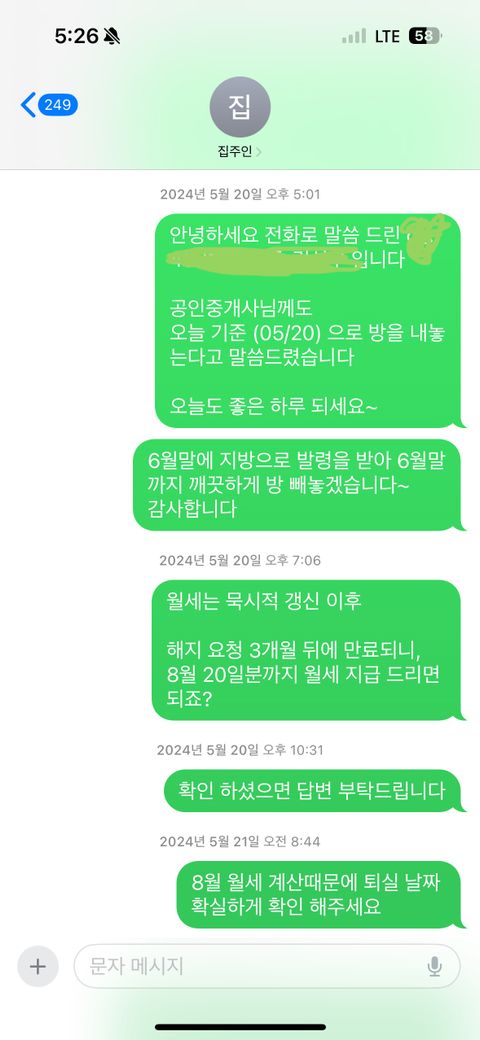 2024.05.20에 집주인분께 계약 종료 의사를 밝혔습니다 (아이폰이라 통화녹음X)