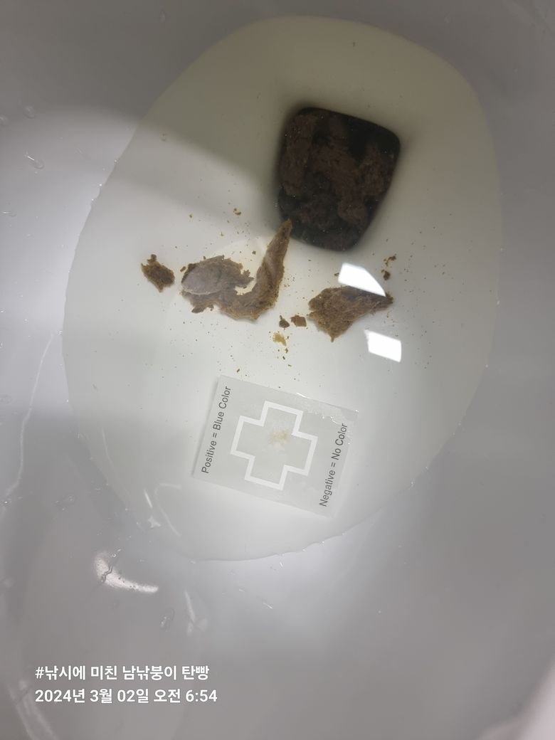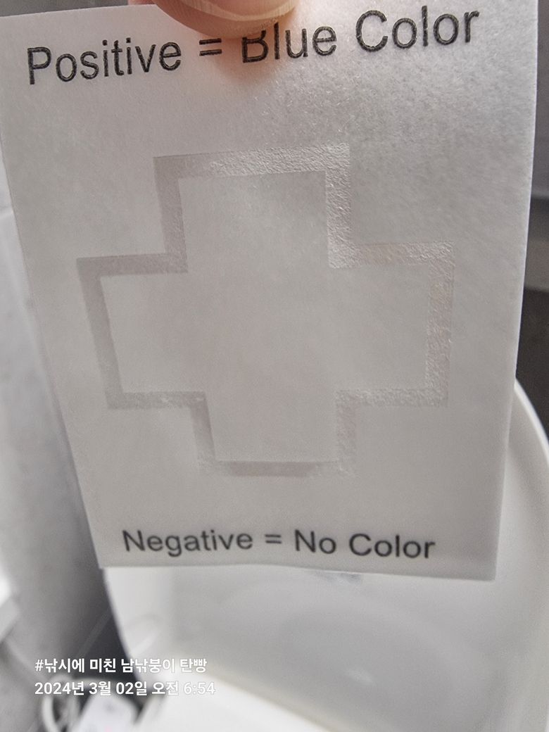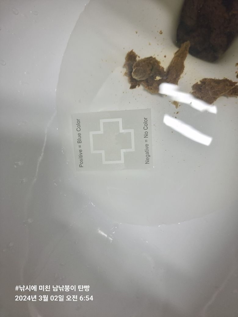 첫째 사진에 노란부분???같은거 있는거 변묻은거입니다 두번째사진이 동일한사진인데 들어보니 가루같은게 물에 알아서 흘러 떨어지고 들고 찍은거 세번째가 다시 물에 종이 띄운겁니다 그래서 세번째 사진 십자간에 건졌다 들어간거같은 자국은 생겼는데 3장 종합해서 봤을때 음성이 맞나요??
