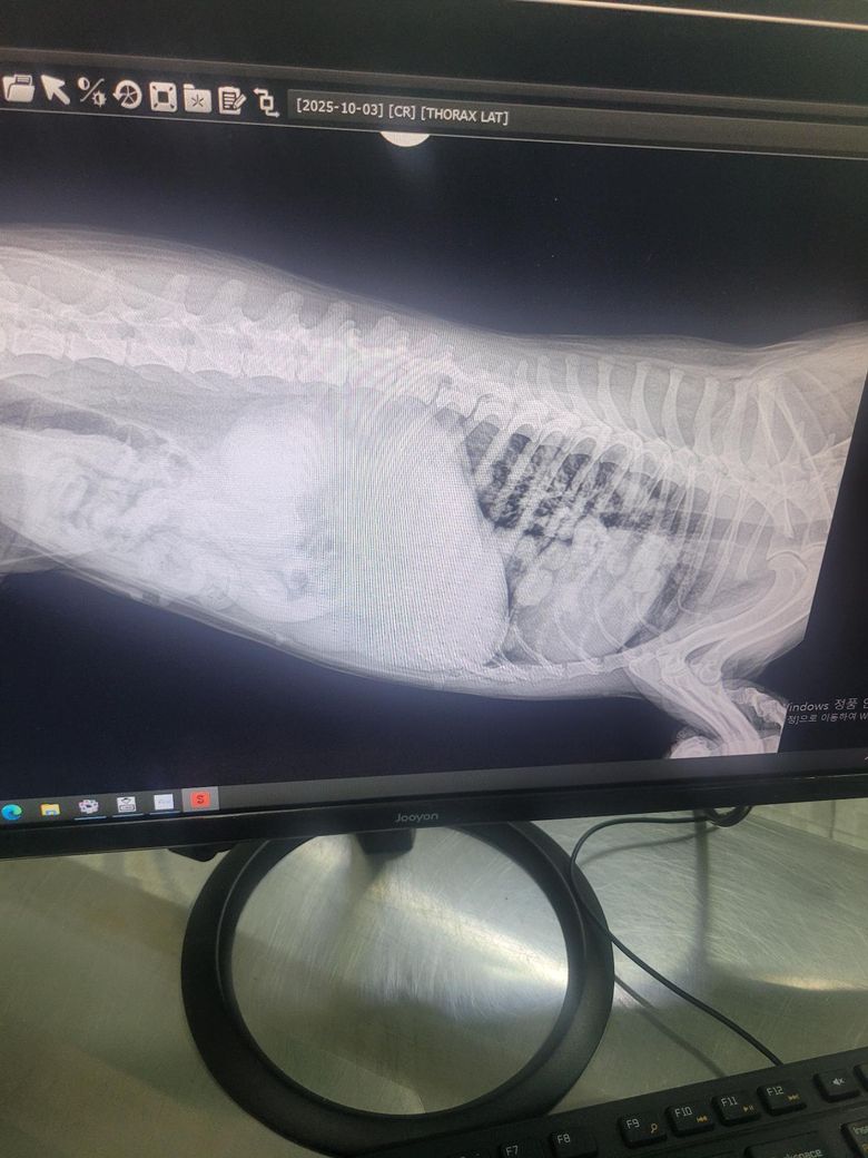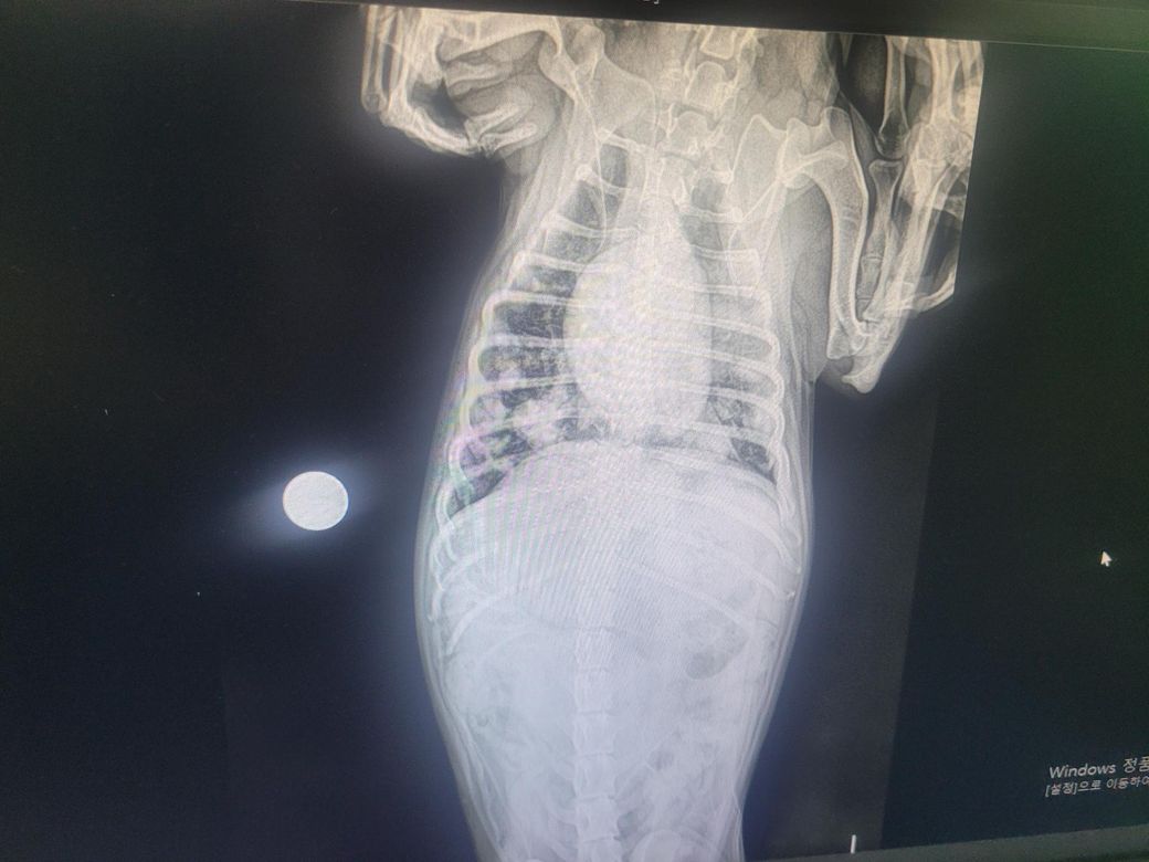 보호자님께서 올려주신 영상을 확인했을 때, 의심되는 정황은 있습니다. 다만 엑스레이의 화질이 떨어져 정확한 판단이 어려운 점 감안해주시기 바라며, 정확한 판단은 항상 병원에 내원하셔서 수의사를 통해 이루어져야 합니다.