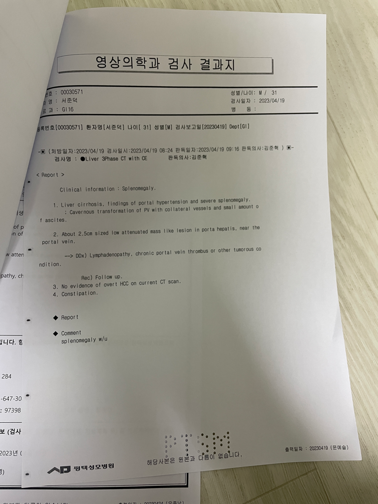 안녕하세요. 조성진 의사입니다. CT결과로는 간경화가 있고 비장이 커져있으나 간암의 소견은 보이지 않는다고 되 있습니다. 그러나 2번소견상 간MRI 검사를 통한 감별진단이 필요 할 것으로 생각됩니다.