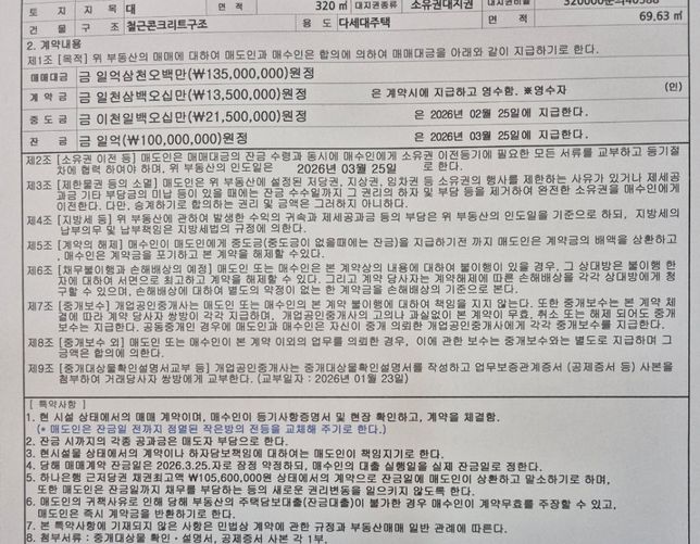 부동산경제신속한거북이176분양권(아파트) 매매계약서 잘 작성했는지 검토부탁드립니다.분양금액: 460,000,000원확장비: 7,670,000원옵션: 15,500,000원프리미엄 마이너스 24,000,000원중도금 대출이 실행 중이며, 이자 후불제라 중도금 일부인 89,000,000원을 기상환한 상황임.현재까지 납부한 금액 234,634,200원은 공급 금액 계약금(10%) 46,000,000원 + 중도금 대출(4회차) 95,000,000원+중도금 상환금액 89,000,000원 + 발코니 확장비 계약금(20%) 1,534,000원 + 추가선택품목 계약금(20%) 3,100,000원임.계약서 내용분 양 금 액금사억팔천삼백일십칠만원정 (₩483,170,000)납부한 금액금이억삼천사백육십삼만사천이백원정 (₩234,634,200)납부할 금액금이억사천팔백오십삼만오천팔백원정 (₩248,535,800)3. 총매매금액(분양금액+프리미엄금액)프리미엄금마이너스 이천사백만원정 (-₩24,000,000 )총매매 금액금사억오천구백일십칠만원정 (₩459,170,000)4. 정산금액정산 지불금금 이억일천육십삼만사천이백원정 (₩210,634,200 )융 자 금금 구천오백만원정 (₩95,000,000) 은 현 상태에서 매수인이 승계함.계 약 금금 일천만정 (₩10,000,000 )은 계약시에 지불하고 영수함.영수자(인)잔 금금 일억오백육십삼만사천이백원정 (₩105,634,200)은 2026년 02월 10일에 지불한다.특약사항본 계약은 분양권 전매계약이며, 공급계약서 원본, 발코니확장형공사 공급계약서 원본, 옵션공사 공급계약서 원본, 신분증 확인 후 하는 계약임. 2. 매도인의 모든 권리와 의무를 매수인이 포괄승계하는 계약이며, 입주 시 제반비용은 매수인이 부담하기로 함(중도금 후불 이자 등) 3. 총 분양금액 483,170,000원은 공급금액 460,000,000원+확장비 7,670,000원+추가선택품목 15,500,000원임. 4. 총 매매금액 459,170,000원은 분양금액 483,170,000원 + 프리미엄 –24,000,000원임. 5. 현재까지 납부한 금액 234,634,200원은 공급 금액 계약금(10%) 46,000,000원 + 중도금 대출(4회차) 95,000,000원+중도금 상환금액 89,000,000원 + 발코니 확장비 계약금(20%) 1,534,000원 + 추가선택품목 계약금(20%) 3,100,000원임. 6. 정산금액 210,634,200원은 공급 금액 계약금(10%) 46,000,000원 + 중도금 대출(4회차) 95,000,000원 + 중도금 상환금액 89,000,000원 + 발코니 확장비 계약금(20%) 1,534,000원 + 추가선택품목 계약금(20%) 3,100,000원 + 프리미엄 –24,000,000원임. 7. 추가선택품목 15,500,000원은 중문(현관) 1,300,000원 + 거실 팬트리 1,700,000원 + 주방특화 5,100,000원 + 시스템 에어컨 5실 7,400,000원임. 8. 중도금 대출과 중도금 후불이자, 잔금(확장비 및 추가선택품목 포함)은 매수인이 잔금일에 승계하기로 한다. 9. 거래인지세는 매도인, 매수인 반반 부담하기로 한다. 10. 본 특약사항에 기재되지 않은 사항은 민법상 계약에 관한 규정과 부동산매매 일반 관례에 따른다.4명의 전문가가 답변했어요