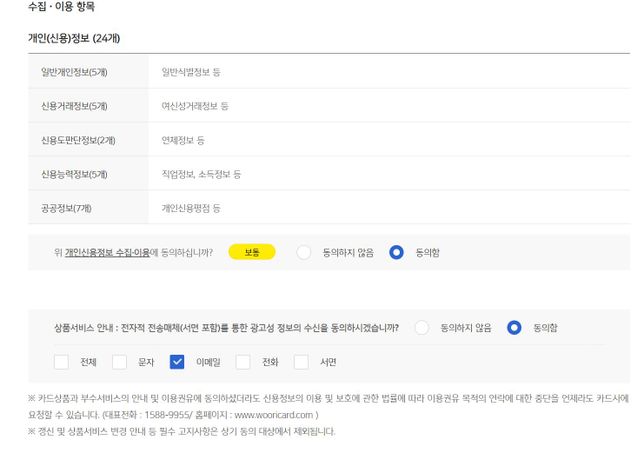 신용카드 발급시 카드고릴라에서 우리카드 SHOPPING+ 신용카드를 발급하여 캐시백 이벤트에 참여하고자 합니다.마케팅(혜택) 정보 전체 수신동의 및 '장기카드대출(카드론)이용 동의'(혜택 제공일까지 유지 필수) 라는 조건이 있는데,마케팅 수신매체를 전체로 하지 않고 저렇게 메일 하나로만 설정해도 되나요?동의한다는게 중요한 것 같은데 이런 참여를 처음해서 잘 모르겠습니다.