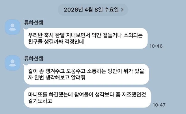 - 고등학교 생활고민상담......담임성생님이 찾아오랬는데 생각이 앜나요ㅜㅜ담임선생님이 저렇게 말하셨는데.. 제가 지금 생각해낸건 롤링페이퍼 하루 파트너 정하기다같이 온라인게임이거 3개 뿐이에요 근데 선생님이 말하신 의도랑은 조금 안맞거나 하기 힘들수도 있어서 다른것들을 추천받고싶어요ㅜ2명이 답변했어요