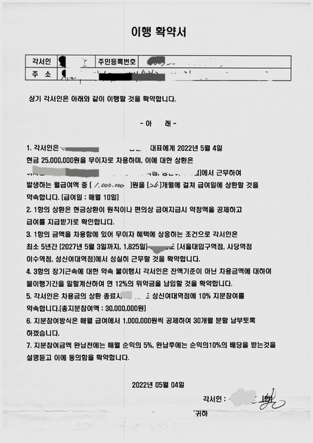 - 기업·회사법률솔직한강아지158중도. 퇴사시 위약금을 내라고 하는데 내야하나요?회사에서 2500 만원을 무이자로 빌려주는 조건으로 25개월로 분활상환 하고 5년간 근무조건과 30개월 동안 100 만원씩 투자 조건으로 협약서를 작성하였는데 일도 넘 힘들게 시키고 입금도 안올라 노예처럼 일을 시켜 중도 퇴사 하겠다고 하니 협약서에 위약금 1200만원을 내라하는데 내야하나요?1명의 전문가가 답변했어요