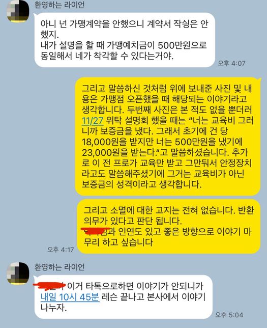 - 민사법률영리한하운드222골프 사업장 프리랜서 보증금 받을 수 있나요?2025년 4월15일 A 사업장 입사를 위해 본사에서 A 사업장만의 레슨법 등을 교육 받았습니다.(일주일에 2번씩 3주, 총 24시간정도)교육이 끝나고 입사 전 교육비라는 명목으로 500만원 지불했습니다. 5월22일 첫 출근을 한 이후 교육비 500만원에 대한 언급은 없었습니다. 또한 근로계약서도 작성하지 않았고 3.3% 세금 떼는 프리랜서로 근무를 시작했습니다. 하지만 매월 교육이 있다며 사업장이 쉬는 날 교육을 의무적으로 듣게 하였고, 레슨 중간에 시간이 나면 본사로 와서 대표님과 이야기하자고 중간에 제가 본사로 이동해 이야기를 한 적도 있습니다.2025년11월27일 제가 현재 근무 하고 있는 A 사업장 위탁운영을 제한 받았습니다. 위탁 설명회에서 교육비 500만원이라는 언급이 나왔는데 이때 “교육비 500만원은 보증금이다. 교육비 500을 지불하면 초기 3개월동안에 30분 레슨당23,000원 지불하지 않으면 18,000원이다. 너는 500을 지불했으니 위탁 운영 시 보증금 500만원을 제외한다.”라는 이야기를 했고 그 이야기를 듣고 당연히 보증금이라고 하셨기에 제가 입사 전 낸 교육비는 돌려받는 금액이라고 생각을했습니다. 위탁 운영의 경우 고정비가 너무 많이 나와 위탁운영 제안을 거절했습니다.1월6일 A 사업장 대표님이 본사로 잠깐 볼수 있냐고 호출을 했습니다. 레슨 중간에 본사에 가서 이야기를 해보니 “본인은 지금 사업장의 지점을 빠르게 늘리고 싶다. 그래서 본사에서 1인 골프레슨 매장 오픈을 먼저 하고 보증금을 받고 들어가는 조건으로 해봐라.”라는 제안을 받았으나 거절했습니다. 거절 하고나서 1월까지만 일을 하고 퇴사를 하려고 한다라고 이야기를 했습니다.1월 19일퇴사이야기를 하면서 초기에 지불했던 500만원을 돌려받을 수 있는지 물어봤지만 돌려줄수 없다고 답변이 돌아왔습니다. 그래서 위탁운영설명회를 할 때 들었던 내용(보증금)을 말씀 드렸더니 말이 바뀌며 “전에 일하던 직원이 교육만 받고 일을 그만두는 일이 많아 이런 안전장치를 둔것이다.”라고 말이 돌아왔습니다. A 사업장 위탁운영설명회에서 내용이 어렵고 계약서 사인을 할 경우 지우려고 했던 녹음파일을 계약서를 쓰지 않아 보관 중이었습니다. 현재 프리렌서로 근무중이며 15분에 11500원, 30분에 23000원을 받고 있습니다.(회사에서 정한 세션비)기본급은 없으며, 정해진 출근시간도 없습니다.하지만 매월 첫째주 일요일 출근강요 했고, 매월 5일 세무사를 통해 3.3%공제후 급여가 들어오나 급여 명세서 본적 없습니다.궁금한점 제가 낸 500만원을 법적으로 받을수 있을까요?현재 대표가 말한 내용 및 운영이 법적 문제는 없는건가요?제가 돈 달라고 한 내용 같이 첨부합니다.1명의 전문가가 답변했어요