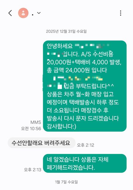 - 민사법률탈퇴한 사용자잘못보낸 문자에 악의적인 답장으로 인한 손해 발생 어떻게 할수 없나요?안녕하세요 의류매장 운영중입니다.아래 내용처럼 AS맡겨주신 고객님의 번호를 잘못 기입하여 수선 안내문자를 보냈고,잘못 문자를 받은 사람이 장난식으로 저렇게 답변하여상품이 폐기처리된 상황입니다.이 경우 잘못 문자를 받은 사람의 답장에 의한 잘못이나 과실은 없나요? 신고하거나 해도 아무런 도움이 안될까요?2명의 전문가가 답변했어요