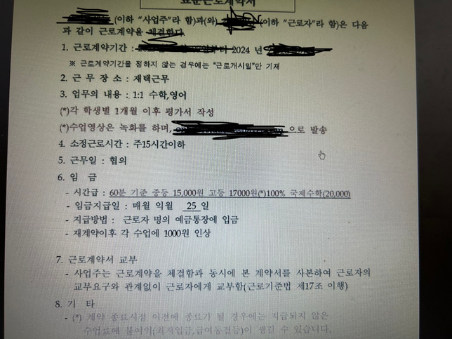 - 지식재산권·IT법률산뜻한너구리19화상과외 수업 결근으로 인한 피해보상 요구화상과외 플랫폼에 선생으로 등록되어 3월 초부터 수업을 진행해오던 중, 5월 16일과 17일에 몸이 아파 수업을 무단으로 결근하게 되었습니다. 미리 이를 플랫폼 측에 고지하지는 못 하였고, 5월 19일 경에 상황을 카카오톡으로 설명하였습니다. 플랫폼 측에서는 전화통화를 요구하였으나 23일 수업 이후 연락을 다시 주겠다고 말하고 수업을 진행하려 하였습니다.하지만 플랫폼 측에서는 수업이 종료되었다고 말하며, 과외학생 측에서 수업 결근으로 인한 피해보상을 요구하고 있다고 말했습니다. 그리고 저에게 그에 대한 보상을 할 것을 요구하고 있습니다. 계약서에는 수업 결근에 관한 조항은 없습니다. 학부모 측에서 플랫폼 측에 피해보상을 요구할 수 있는지, 그리고 그에 대한 보상을 제가 해야하는지 궁금합니다. 첨부된 내용은 계약서입니다. 이외의 계약사항은 없습니다.2명의 전문가가 답변했어요