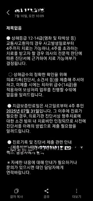 - 교통사고 과실보험내일도도움되는기술자보험사에서 이런문자를받았는데 진단서 보내줘야하나요?7월4일 무과실 교통사고로 현재 8일정도 통원치료 중인데요..10일 보험사에서 이런문자를 받았는데 진단서 보내라는건가요?10날 보험사 대인담당자 연락오구 몸좀어떻시냐?등등 치료잘받으시라고 하고 합의관련말은 없었는데요..전화끊고 이런문자가 와서요 통상적인 안내문자인가요?4명의 전문가가 답변했어요