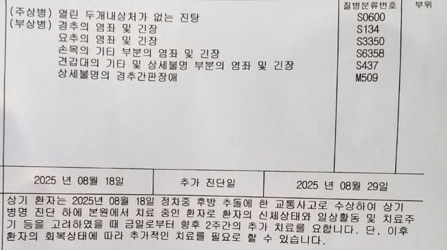 - 교통사고 과실보험신통한집게벌레220상대과실 100% 합의금이 이게 적정한가요?고속도로 갑자기 정체되서 차가 정차하고 있었는데 카니발이 제 스파크를 그대로 박았습니다.8월18일 사고나서 4일입원하고 아래코드를 받았고아직까지 손목을 돌리면 통증이있어서 치료중입니다.350만원을 제시했는데 이게 적정선인가 싶어서요손해사정사 계시면 조언부탁드립니다3명의 전문가가 답변했어요