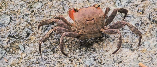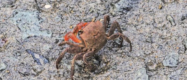 경남 거제. 바닷가 산책을 하며 발견한 게입니다. 도둑게, 붉은발말똥게? 어느 쪽인지요? 헷갈려서 여쭤봅니다. 다리 쪽에 털이 있는 것처럼 보입니다.