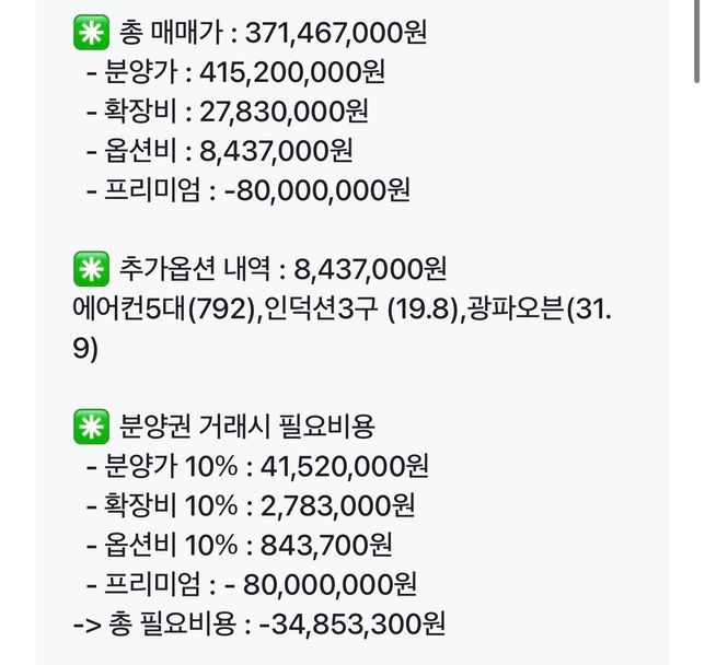 아파트 매매를 위해 보다보니 이해가 안가서 질문드립니다 사진 속에 총 매매가가 있고, 분양권 거래시 필요 비용이 있는데 여기서 총 필요비용이 -3,485만원정도인데 이 금액을 총 매매가에서 뺀 금액이 제가 매매할 금액인가요? 부동산에 여쭤보니 마이너스를 현금으로 돌려주는 건 어렵고 매매가에 어쩌고 하시던데 그게 -를 해준다는건지 어떻게 하겠다는 건지 이해가 안가서요ㅜㅜ잘 아시는 선생님들 사진보고 해석좀 요청드립니다!!꼭 좀 도와주세요🙏🏻💜