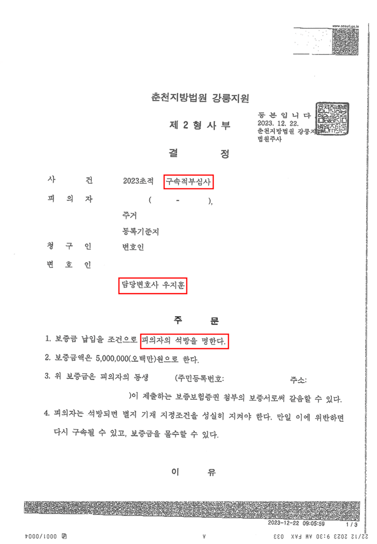 법원은 의뢰인에 대한 구속적부심사에서 석방 결정을 내렸습니다.