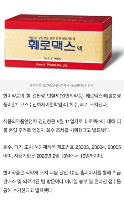 - 약 복용약·영양제Q. 동네 약국에서 추천받은 액상철분제 훼로맥스 액을 구매했는데 찾아보니 회수조치된 상품이더라구요 문제없나요?..동네 약국에 액상철분제를 달라하니 사진과 똑같은 훼로맥스 액을 주셔서 구매했는데 찾아보니 회수조치된 상품이더라구요 문제없나요?..이미 4병 먹었습니다ㅠㅠ 기사에 나온 제조번호랑 다른거긴한데 걱정돼서요
