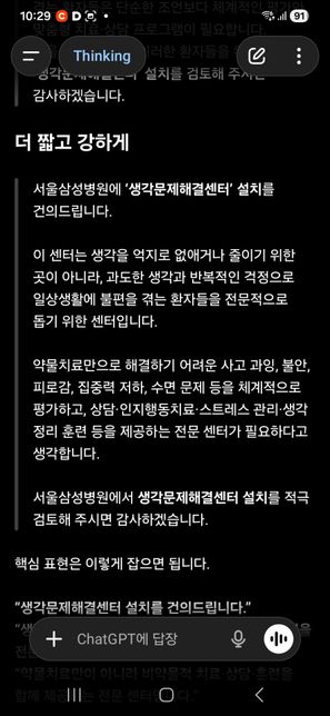 - 생활꿀팁생활Q. 서울삼성병원에 ‘생각문제해결센터 설치’를 건의했는데, 취지에 맞지 않아 답변이 어렵다는 말은 어떤 의미인가요? 서울삼성병원에 **“생각문제해결센터 설치”**에 대한 건의를 드렸는데, 담당자께서 **“취지에 맞지 않아 답변이 불가하다”**는 식으로 말씀하셨습니다 제가 건의한 취지는 단순히 생각을 억지로 줄이거나 없애자는 것이 아니라, 과도한 생각, 반복적인 걱정, 사고 과잉 등으로 일상생활에 불편을 겪는 사람들을 전문적으로 도와줄 수 있는 센터가 필요하지 않겠느냐는 내용이었습니다 그런데 병원 측에서는 이 건의가 고객의 소리나 일반 상담 창구의 취지와 맞지 않는다고 본 것 같습니다 이 경우 담당자가 말한 **“취지에 맞지 않는다”**는 표현은 어떤 의미로 이해하면 될까요 예를 들어 병원 고객의 소리 창구는 주로 진료 불편, 예약 문제, 직원 응대, 시설 이용 불편 같은 내용을 접수하는 곳이라서 새로운 센터 설치나 병원 운영 정책에 관한 제안은 답변 범위가 아니라는 뜻일까요 또는 “생각문제해결센터”라는 표현 자체가 의학적으로 너무 포괄적이거나 모호해서, 병원 입장에서는 기존 정신건강의학과 진료나 상담 프로그램으로 다뤄야 할 사안이라고 본 것일 수도 있을까요 제가 보기에는 담당자의 답변이 “내용이 무조건 틀렸다”는 뜻이라기보다는, 접수한 창구의 성격이나 병원에서 답변할 수 있는 업무 범위와 맞지 않았다는 의미처럼 느껴지기도 합니다 이런 경우에는 다시 건의하려 **“생각문제해결센터 설치를 요구합니다”**라는 표현보다 **“과도한 생각과 반복적 걱정으로 어려움을 겪는 환자를 위한 전문 평가·상담 프로그램 또는 장기적 전문센터 개설 검토를 건의드립니다”**처럼 표현하는 것이 더 적절할까요 서울삼성병원 같은 대형병원에 특정 센터 설치를 건의했을 때, 담당자가 **“취지에 맞지 않아 답변이 불가하다”**고 하는 것은 정확히 어떤 뜻인지 궁금합니다