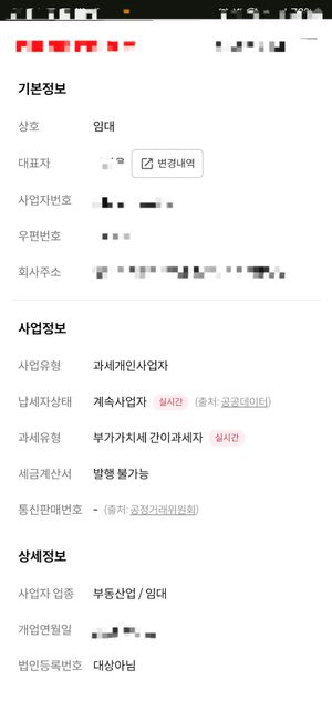 - 민사법률Q. 임대 사업자 회사주소가 살지도 않는 상가주택에 되어있어도 상관없는 건가요?제목 그대로입니다. 임대 사업자 회사주소가 사업하지도 않는 자기 상가로 되어 있어도 상관없는지요?정정이나 변경을 해야 하는 거 건가요? 혹시 그대로 유지 시 법적으로 불이익이 있는지요?