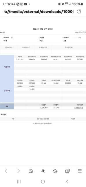 - 임금·급여고용·노동Q. 최저임금 위반인지 봐주시길 부탁드립니다.전 덤프트럭 기사입니다. 저번달 7월 5일 새로운 회사에입사하였고 조건은 주6일 월~토 근무 하루에 10시간근무1시간휴식 매달 2번휴무(주52시간 맞추기 위함이라함)4대보험가입.세전월급 360 입니다. 기본급이 얼마고 수당이얼마고 이런설명없이 그냥이렇게만 듣고 오늘 첫월급이 들어왔고월급내역서를받았는데 받고 좀어이가 없더군요.이게 맞나싶습니다.최저임금 위반인거 같기도 싶구요. 계산하는방법을 찾아계산해보려해도 도대체 무슨말인지몰라 혼자선 도저히 못하겠어서 이렇게 도움을 요청합니다.내역서 한번봐주시고 맞는건지최저임금이 안되는건지 자세한설명과 부탁드립니다