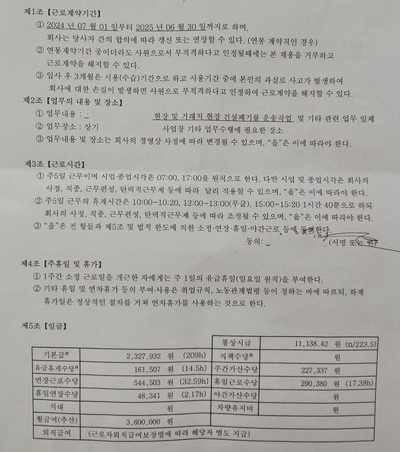 - 임금·급여고용·노동Q. 최저임금 위반인지?이임금 맞는건지? 봐주세요.직장을 옮기고 첫월급을타고 내역서와 근로계약서를교부받았습니다.그런데 면접당시 근로계약서에 작성되어있는자세한내용은 설명하지않았고, 세전월급360,세후월급이310정도될꺼라는 이야기만 들었습니다.첫월급을 받고 내역서를받은뒤 기본급은 터무니업이 적게 적혀있었고 각종수당들과 상조회비가 적혀있길래 이게 뭐냐 이해가안간다 했더니 주52시간인가 주50시간인가 법적으로 그게생기면서 그걸맞추기위해원래는 형식적으로 주5일제 근무로하고 저희는 토요일까지 근무를하기때문에 휴일근로수당으로 드리고 어쩌고저쩌고하는겁니다(녹음내용있음) 근데 알아보니 포괄산정된 시간외 근로수당등은최저임금에 포함되지 않는다고 하더라구요.그래서 궁금합니다.내역서랑 근로계약서 첨부합니다.1. 최저임금 위반인지?2. 제가받고 있는 월급이 맞는건지?자세한답변 부탁드리겠습니다