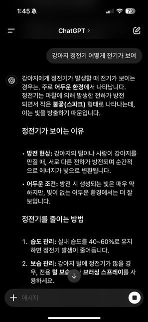 - 반려동물 건강반려동물Q. 강아지 정전기 어떻게 해결하나요? ?집이 건조하긴 하지만, 꿉꿉해서 강아지 냄새랑 섞이진 않아서 좋았습니다 하지만 자려고 누었더니, 자취4년차에 매트리스를 15만원주고 전기장판 사용 안되는 회색 스펀지 같은 매트리스입니다. 저는 편한데 강아지한테 이렇게 정전기를 보이니원인을 모르겠는데 사람으로 따지면 팔 한쪽이 정전기 오르는 느낌이라 소름끼칩니다 어떻게 하면 해결할 수 있을까요사진 오른쪽 부분이 정전기 오른 강아지 다리입니다