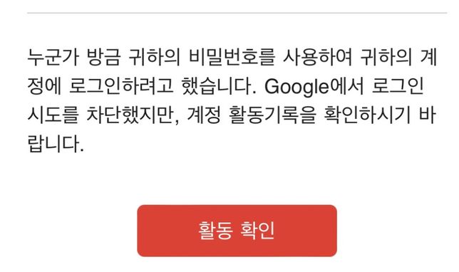 - 기타가전디지털·가전제품Q. 모르는 사람이 제 구글 계정에 접속하려는 것 같아요제가 경기도 사는데, 부산 광역시? 거기서 어떤 분이 로그인 시도중인데, 본인이 맞냐고 알림이 왔어요 너무 놀라 아니라고 표시한 후, 비번 바꿨는데 너무 불안해요 원래 이런 일이 있을 수 있나요?